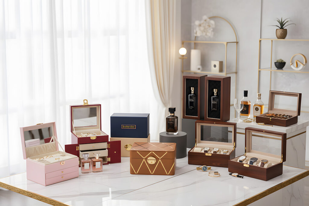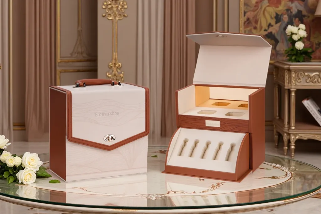 We provide high-quality PU leather, exquisite wood, maple, walnut, and real leather, among other materials. Grains in matte, gloss, or natural wax are displayed in wooden boxes that combine CNC accuracy with artisan finishing. Exact stitching, well-cut panels, and optional double wraps are characteristics of leather boxes. In a market that is highly competitive, every little element improves touch, style, and brand appeal.